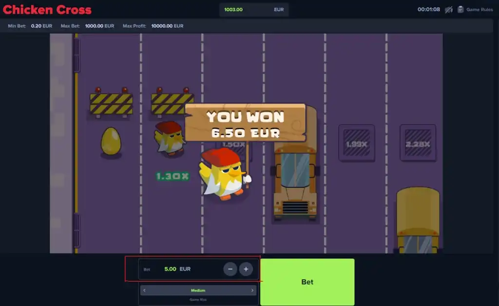 You are always making the same choice. Step forward and increase the reward, or stop and lock in what you already have. There is no randomness hidden behind symbols or reels. The tension comes from deciding when to quit before the chicken burns. That structure creates a very clear volatility curve. Low risk at the start. High risk near the end.
